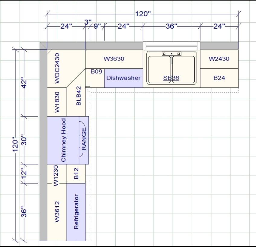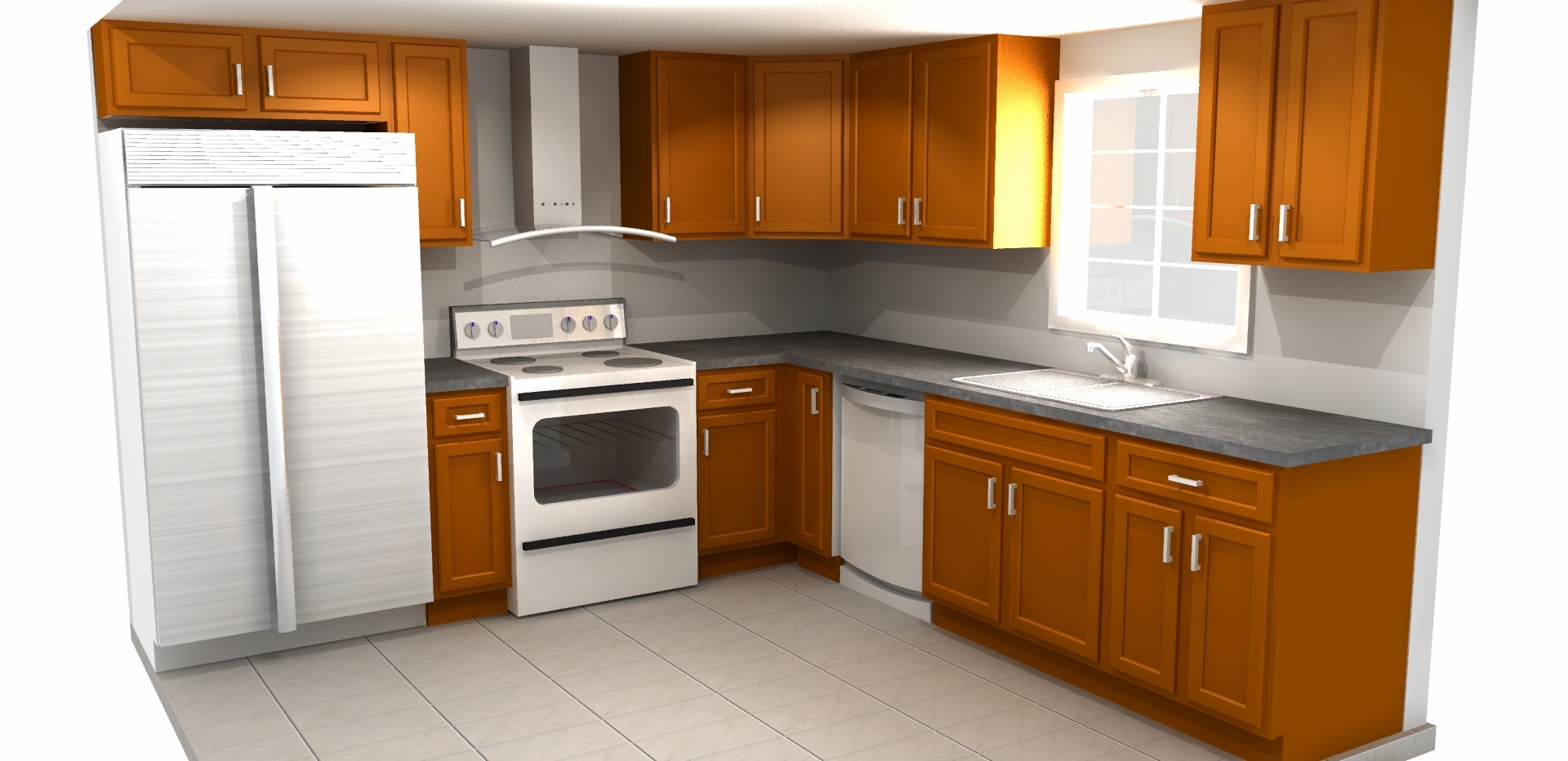 A 10'x10' Kitchen is a sample kitchen used for universal price comparisons across different cabinet types and styles. The kitchen industry uses the 10'x10' kitchen layout to give the consumer a general idea of what that particular cabinet door style costs. The actual cabinet order for your layout may be more or less, based on overall size and cabinet options selected. The 10'x10' Sample Kitchen is based on the 12 items listed below and does not include crown molding, decorative hardware, countertop, sink/faucet or appliances. The drawings shown below are a sample of what you can expect to receive when you get a FREE kitchen design from Toronto Cabinetry Canada. You can also visit our Design page for more information regarding your kitchen cabinet design.